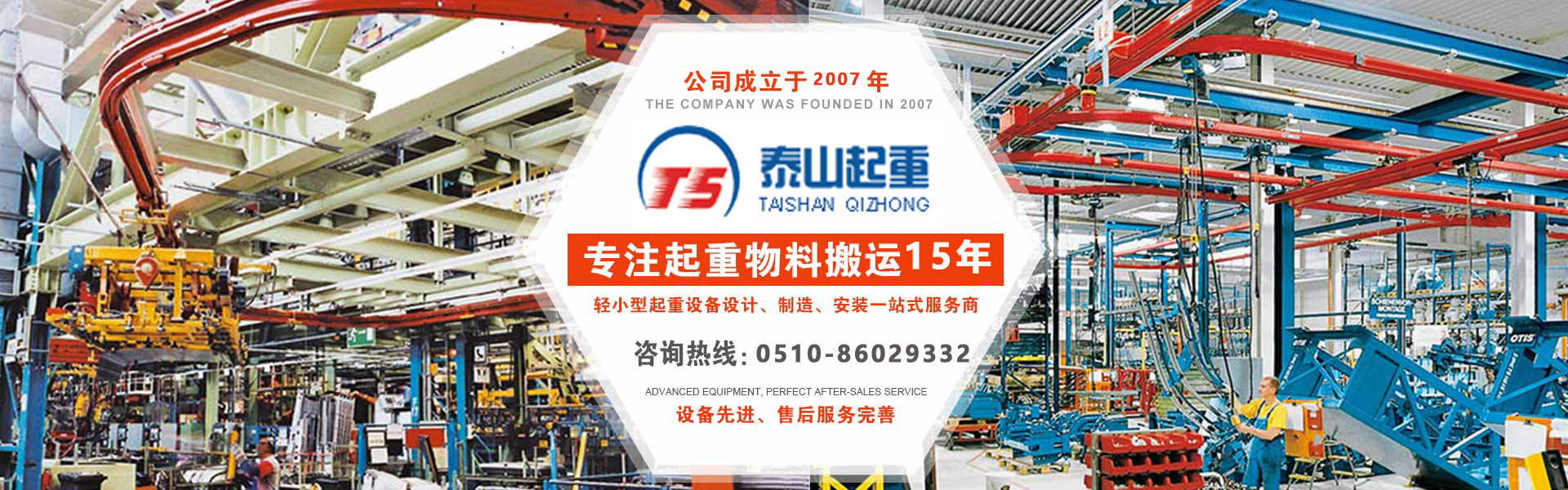 江陰市泰山起重設備有限公司座落在富庶的現代化港口城市——江陰市南閘鎮工業園區,緊靠錫澄高速,錫澄路,北依江陰港區,貫通滬寧高速的世界第四、中國第一的江陰長江大橋,穿越而過,飛架南北,高速至上海虹橋機場僅2小時,南又緊靠正在建設中的無錫國際機場,交通便捷,環境優美。  本公司專業為壁行式懸臂起重機、KBK軌道,鋼絲繩電動葫蘆、環鏈葫蘆、KBK組件,梁式起重機、電動旋臂起重機等配套起重機械配件,主要產品有:KBK軌道,梁吊掛裝置、環鏈葫蘆,KBK組件,手動式小車、行車走輪、電纜滑車等起重機配件,同時可提供起重設備的安裝、維修、為客戶提供全方位的技術咨詢等各項服務。  公司的管理將“以人為本”作為宗···...
